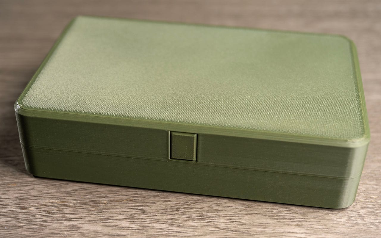 The third thing that stood out was how the mechanical parts behaved. The box has a printed hinge and a small spring latch. The hinge moved freely the moment the print finished—no snapping it loose, no forcing anything. Even more interesting, the little printed spring felt noticeably more elastic than the same design printed in PETG. It returned to shape more cleanly and had a snappier feel.